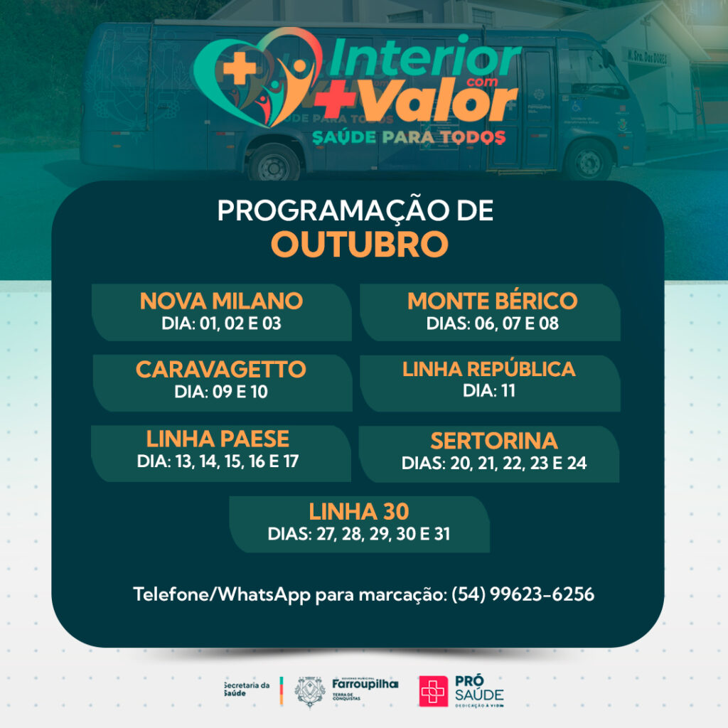 Com o objetivo de levar os atendimentos em saúde para a população do interior do munício, o Programa Interior Com Mais Valor, leva os atendimentos da Unidade Móvel de Saúde para sete comunidades neste mês de outubro