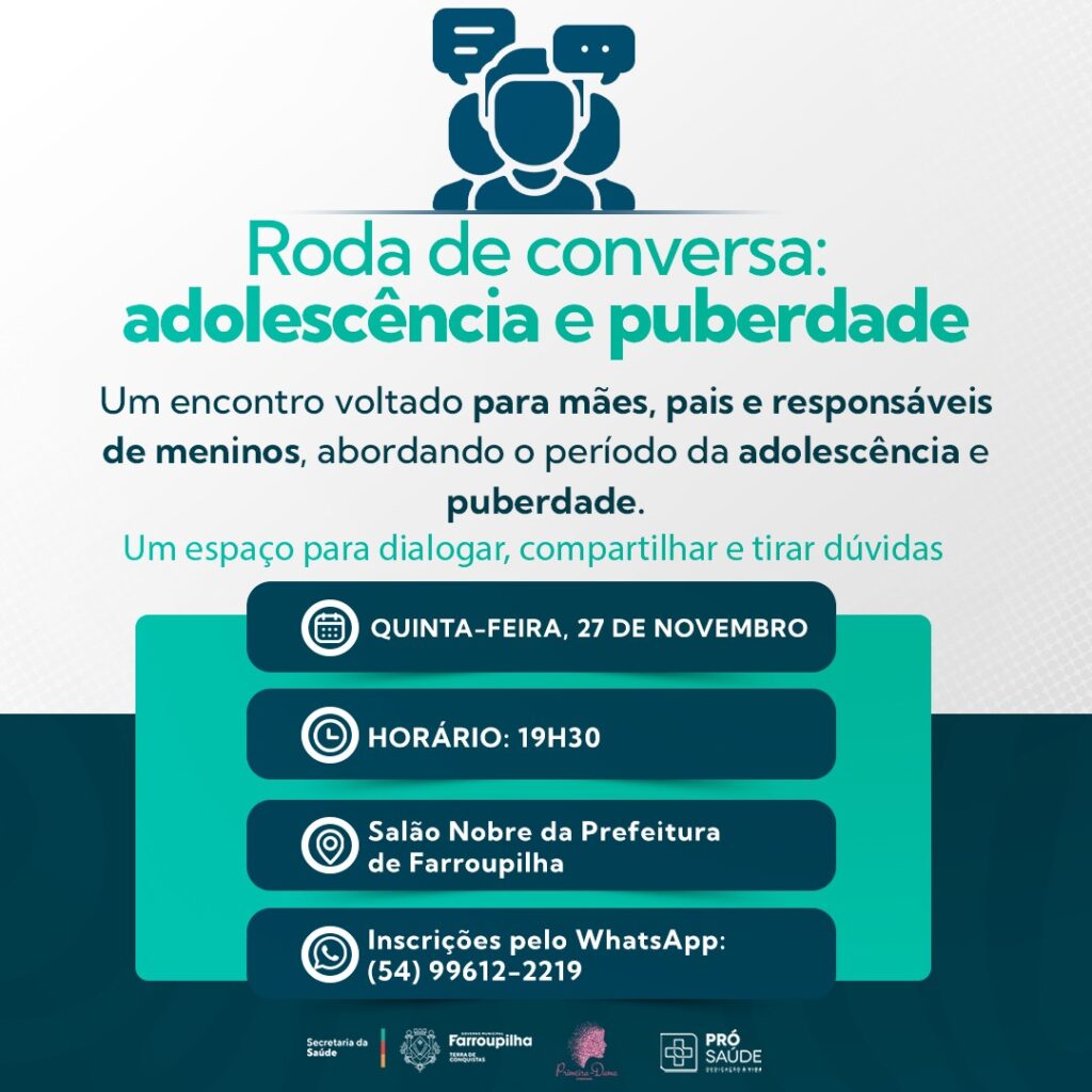 A Prefeitura de Farroupilha, por meio do Gabinete da Primeira-Dama, da Secretaria da Saúde e da Associação Farroupilhense Pró Saúde, promove, na próxima quinta-feira, 27 de novembro, uma roda de conversa sobre adolescência e puberdade, voltada especialmente para pais, mães e responsáveis por meninos de 9 a 12 anos.