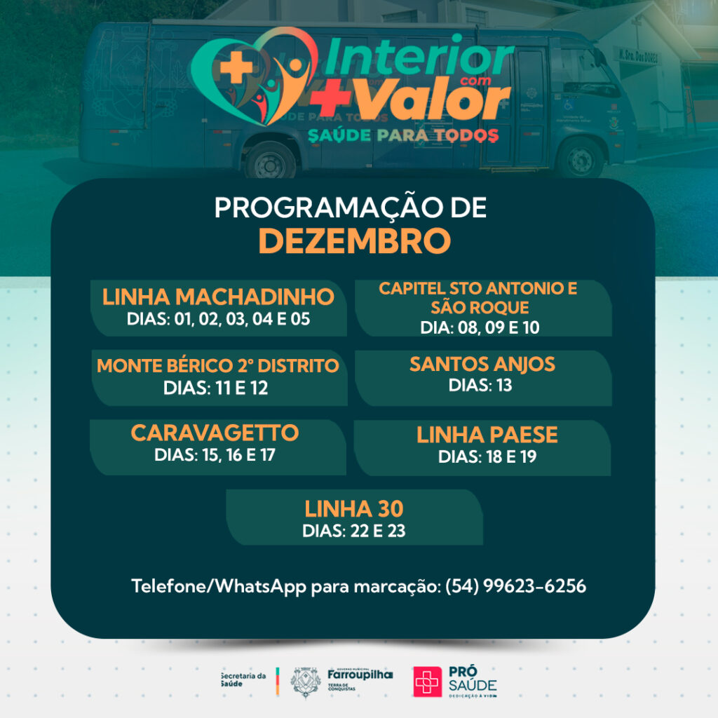 Para garantir mais acesso e cuidado à população do interior, a Prefeitura de Farroupilha, por meio do Programa Interior Com Mais Valor, leva a Unidade Móvel de Saúde para diferentes localidades ao longo de dezembro. Confira a agenda;
