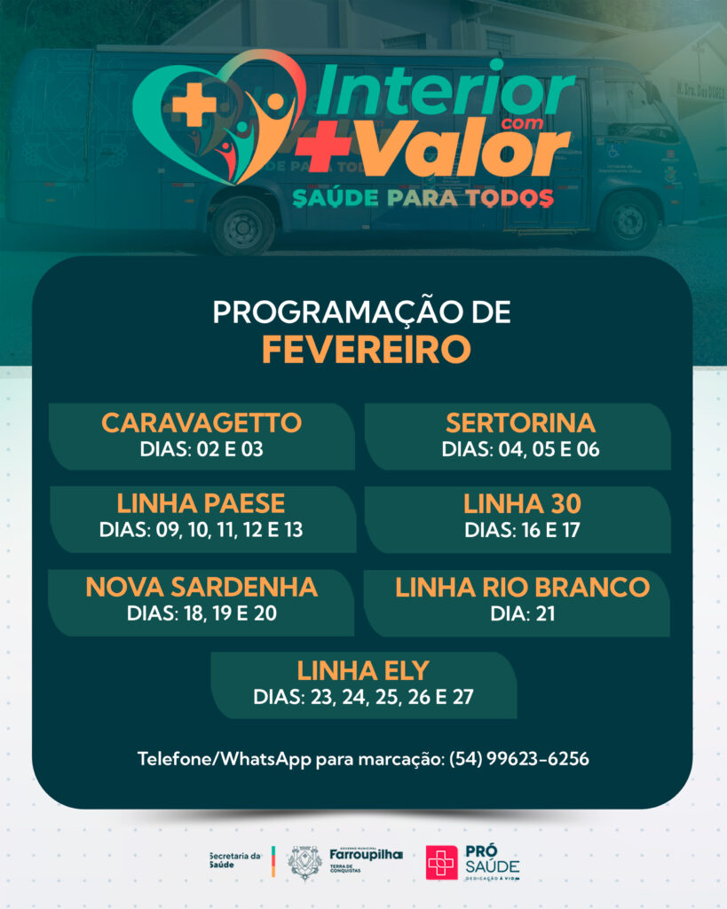 Em uma ação especial, a Unidade Móvel de Saúde estará, entre às 8h e às 12h, do sábado, 21 de fevereiro, na comunidade de Linha Rio Branco.